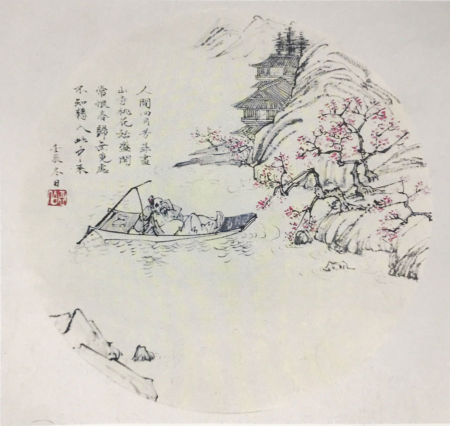 题目:“人间四月芳菲尽,山寺桃花始盛开;长恨春归无觅处,不知转入此中来。”唐·白居易要求:根据以上诗意,画一幅人物习作,构图完整。设色淡雅,可钤印。
